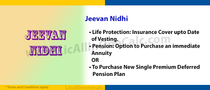 LIC’s New Jeevan Nidhi Plan is a conventional with profits pension plan with a combination of protection and saving features. This plan provides for death cover during the deferment period and offers annuity on survival to the date of vesting.• Minimum Basic Sum Assured: Regular Pay – Rs.1,00,000/-